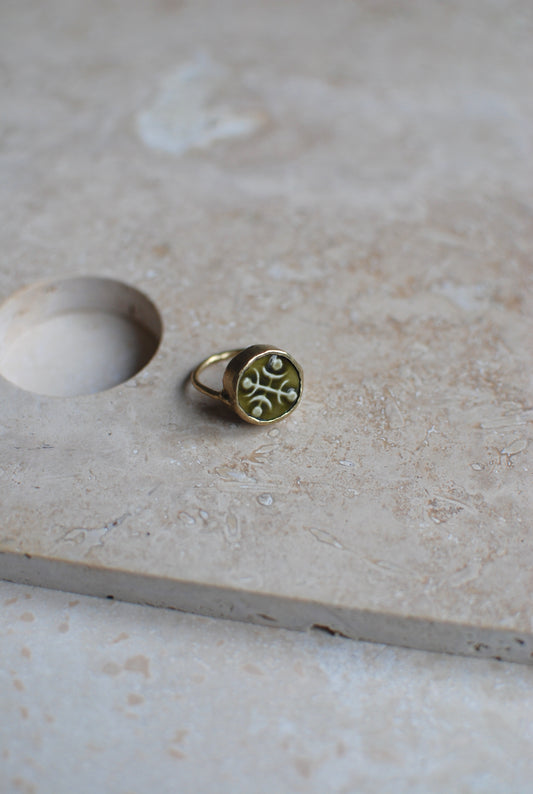 Solid Brass & Olive Green Glazed Vintage Stoneware ‘Totem Wheel’ Ring