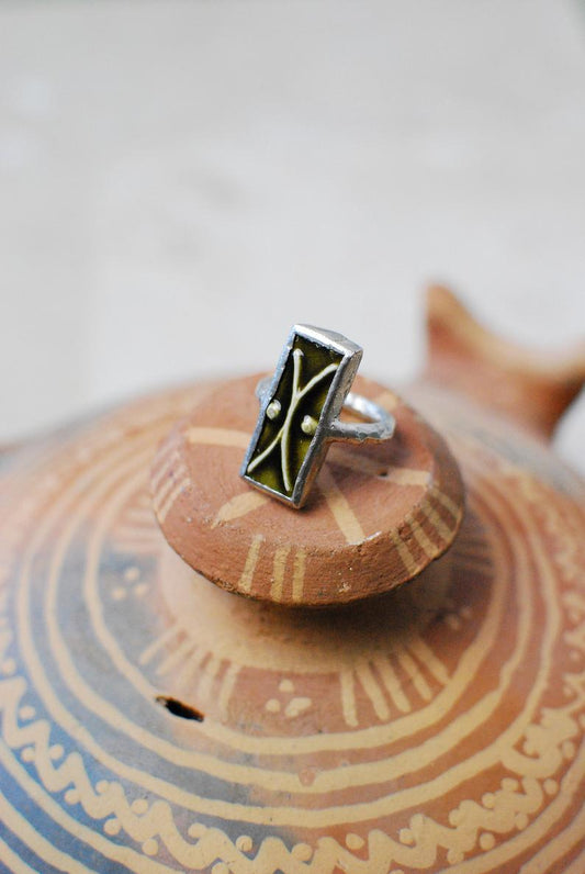Solid Silver & Vintage Green Moss Glaze Stoneware ‘Cypher’ Ring