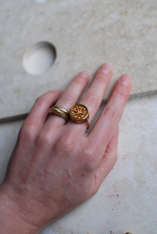 Solid Brass & Amber Glazed Vintage Stoneware ‘Totem Wheel’ Ring