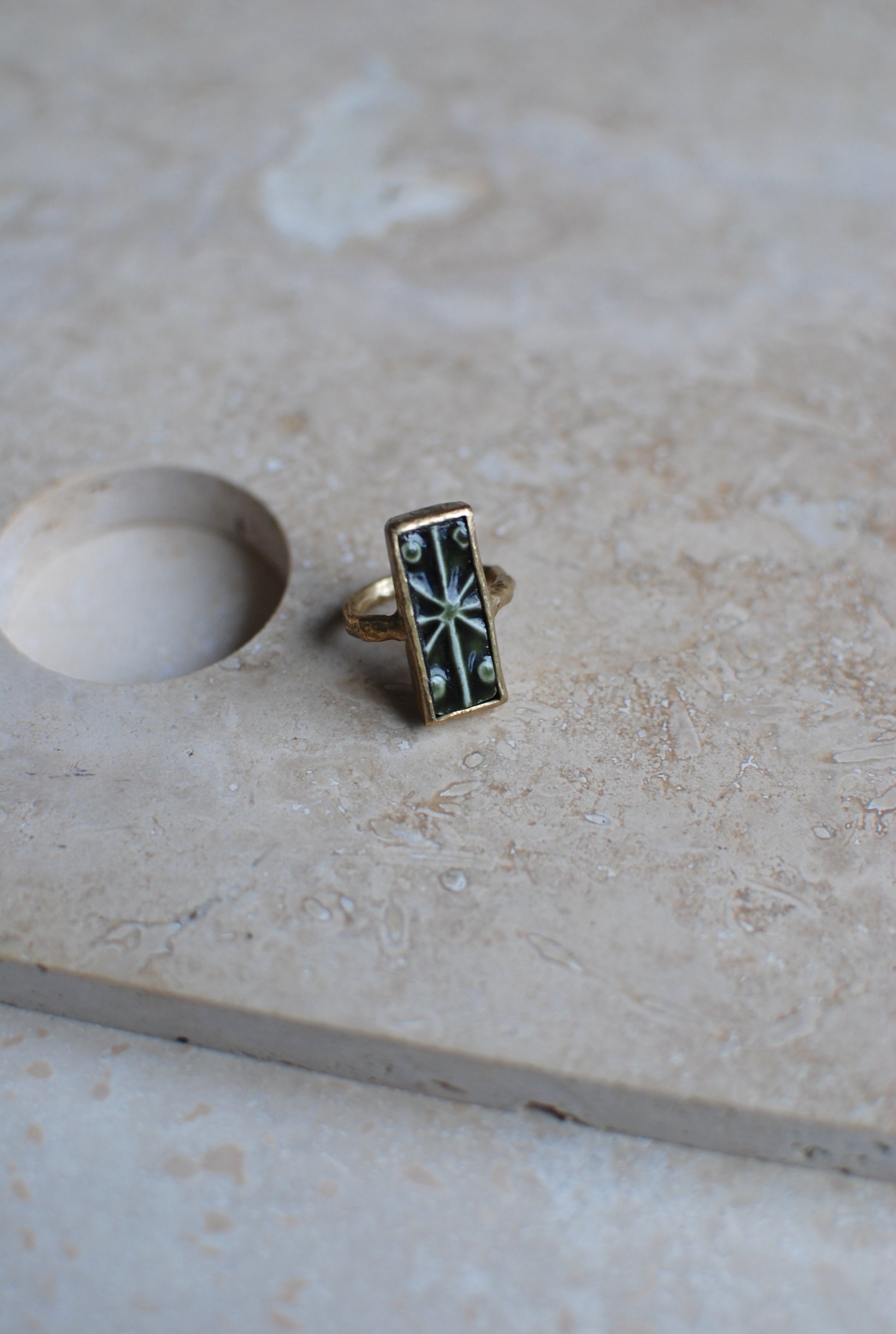Solid Brass & Vintage Dark Forest Green Glaze Stoneware ‘Cypher’ Ring