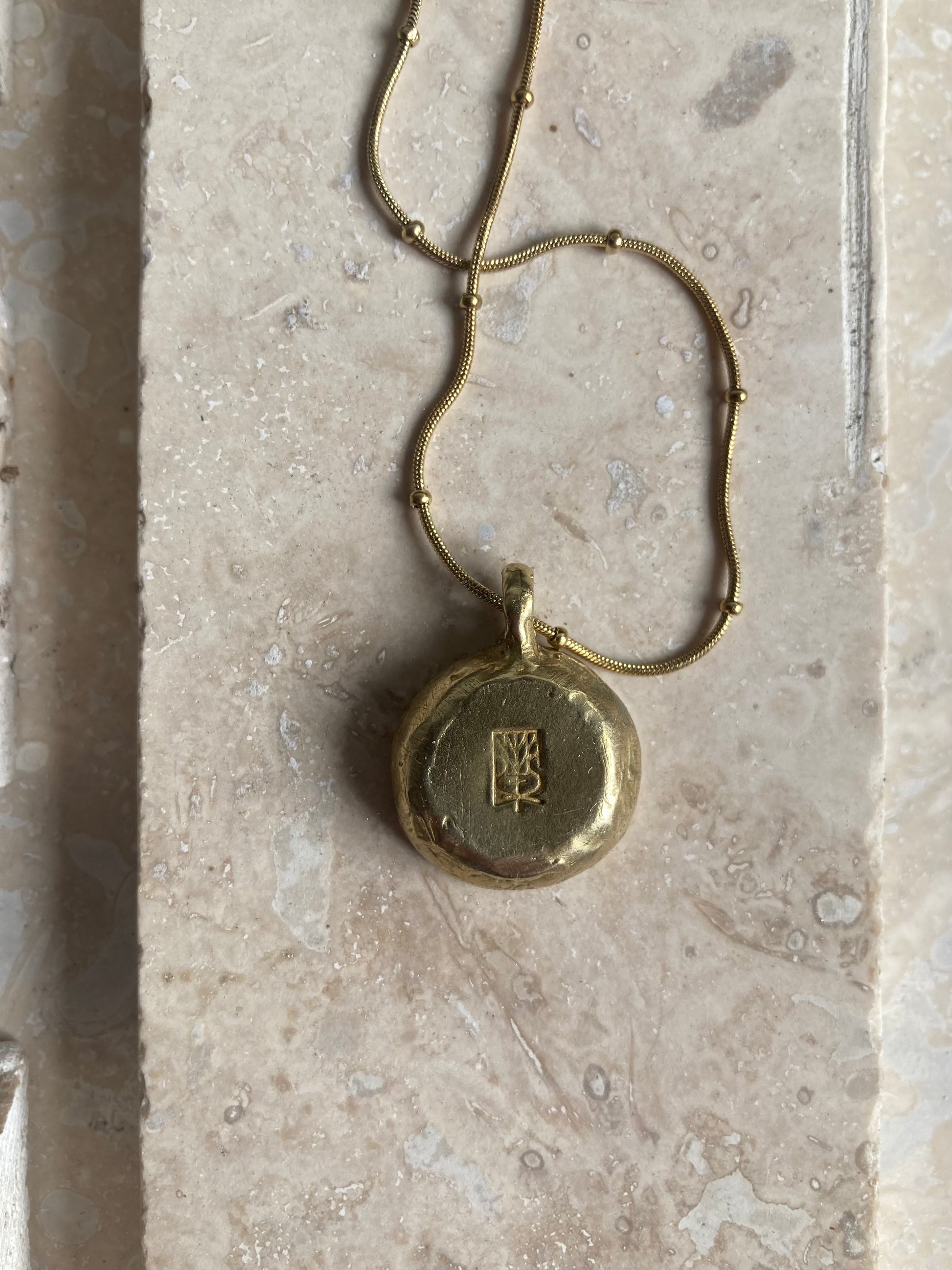 A precious symbol embossed piece of vintage 1970’s Portmeirion is set in a hand-carved wax-cast pendant of solid polished brass & strung on a 14k plated stainless steel chain.