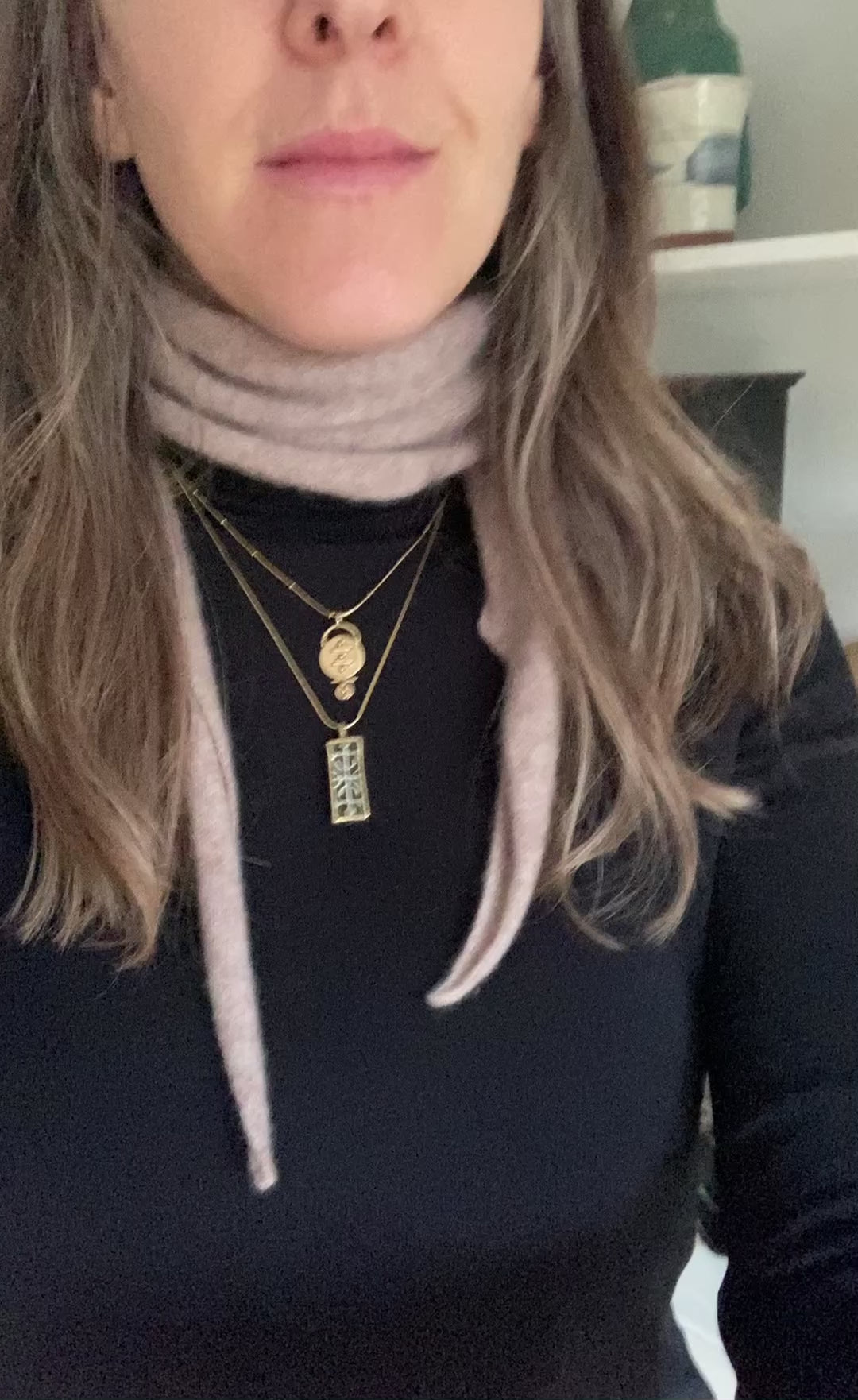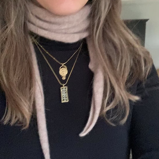 A precious symbol embossed piece of vintage 1970’s Portmeirion is set in a hand-carved wax-cast pendant of solid polished brass & strung on a 14k plated stainless steel chain.